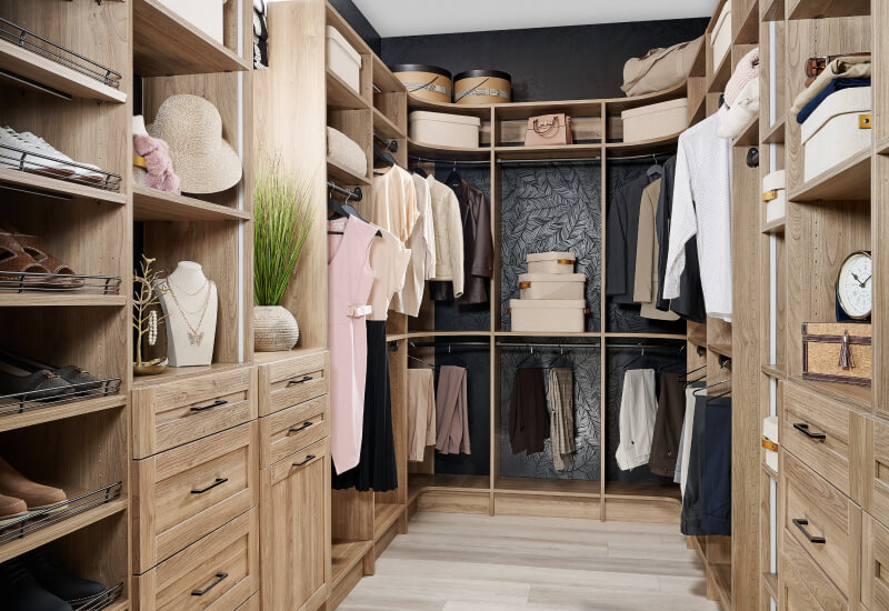 A guest room closet showcases ShelfTrack EVO’s new Mountain Ash finish.